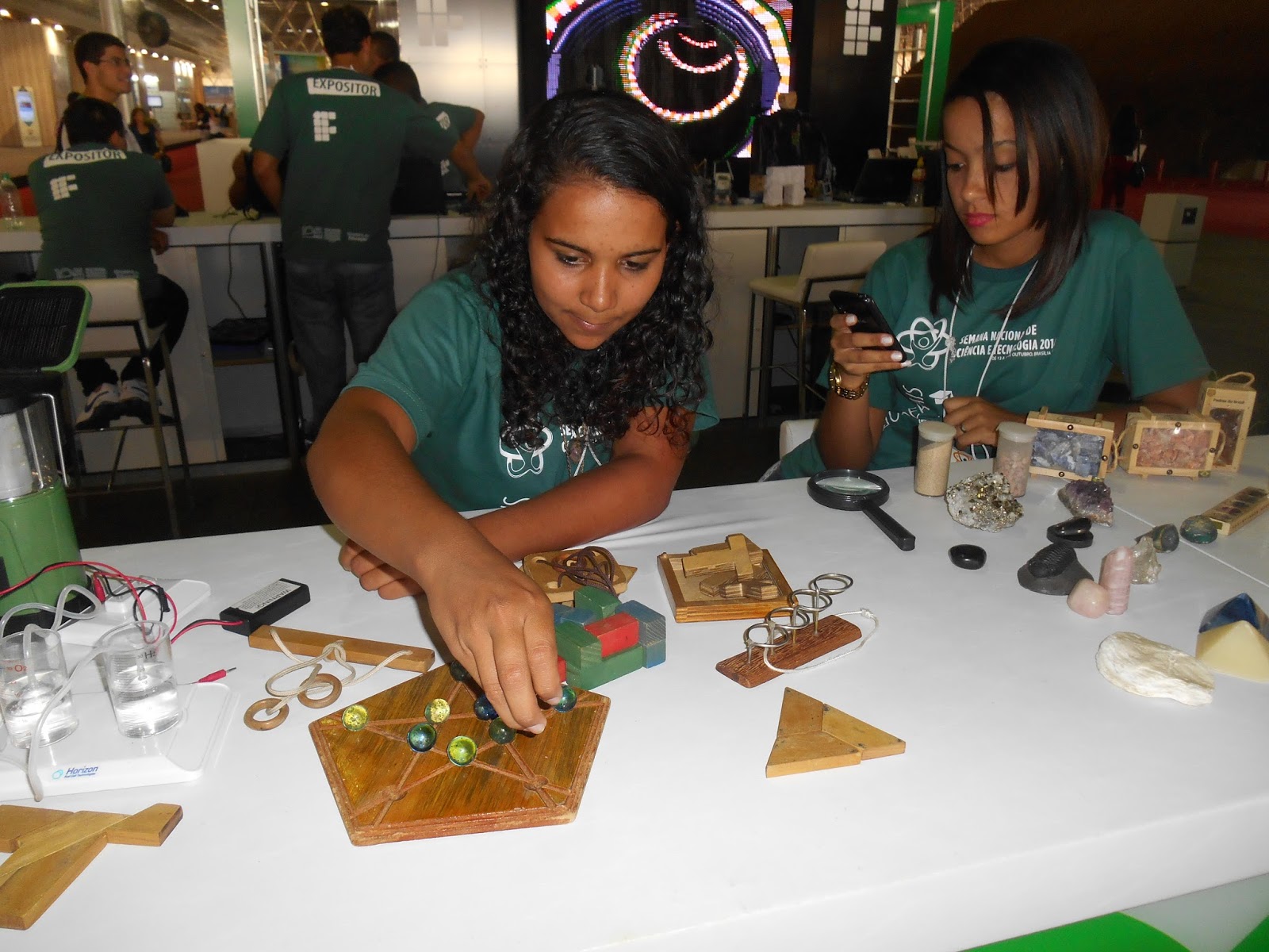 Estande da CCI: Outro colégio de Brasília, em que mostravam alguns experimentos científicos. Tinham até aquele da eletricidade estática que arrepia o cabelo da pessoa, mas não funcionou na hora por algum motivo. Ainda haviam muitas maquetes de aviões e coisas relacionadas ao lixo, energia limpa e sustentabilidade.