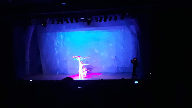 Começamos o espetáculo com uma criatura amarela se apresentando, ela também interagia com uma espécie de estrela do mar e chegaram até a andar um pouco pela plateia, fazendo algumas coisas principalmente para alegrar as crianças pequenas.