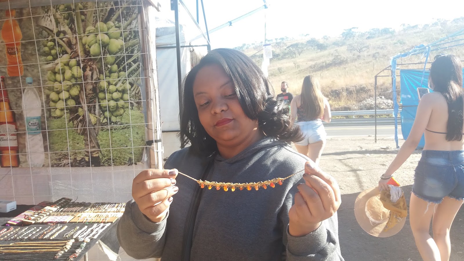 Já a Lu ficou vidrada mesmo nas dezenas de opções de colares e pulseiras que o moço do lado estava vendendo e não perdeu tempo, experimentou as que achou mais bonitas e comprou elas sem pestanejar.