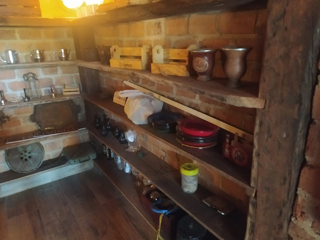 O restaurante era muito grande, porque além da parte que a gente estava também havia uma área abaixo, depois de se seguir por umas escadas. Nessa parte havia uma espécie de mini-museu com algumas coisas antigas e uma boa área com um jardim e também algumas jabuticabeiras.